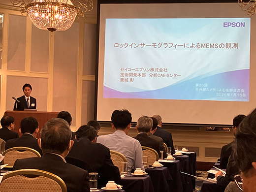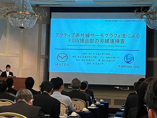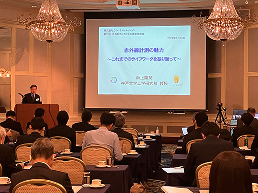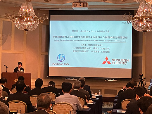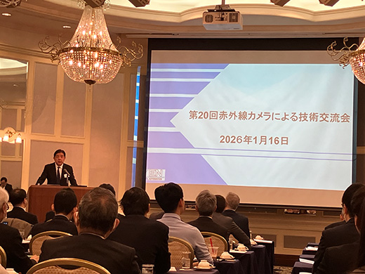 約70名のお客様をお迎えし第20回赤外線カメラによる技術交流会を開催いたしました。講演は、Noxant社製冷却型赤外線カメラを利用したドローン検知および無力化について活用事例を交えた紹介や、アクティブサーモグラフィ法を利用したFSW(摩擦攪拌接合)接合部の非破壊検査に関する研究成果発表、ロックインサーモグラフィを利用したMEMS(微小電気機械システム)の動作観測事例の紹介、Telops社製ハイエンド赤外線カメラを用いた高速発射体の赤外線画像による観察事例の紹介、さらには赤外線分光法やDIC(デジタル画像相関法)を用いたエポキシ樹脂の疲労損傷評価に関する研究成果発表、アクティブサーモグラフィ法を利用したダイキャストや溶接部の亀裂検出に関して熱励起手法別に特長を比較した発表に加えて、2026年に退官なされる神戸大学 阪上教授よりご自身の研究実績を振り返りながら、その一部として赤外線計測による長大鋼橋の非破壊検査事例や経年プラントにおけるガス漏洩検知等の研究成果発表がなされました。