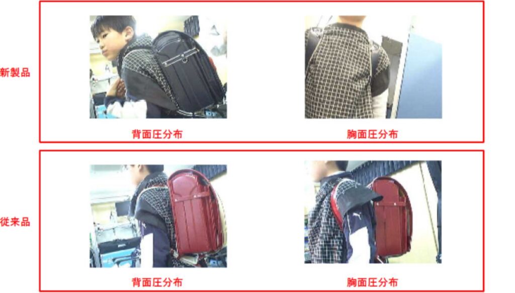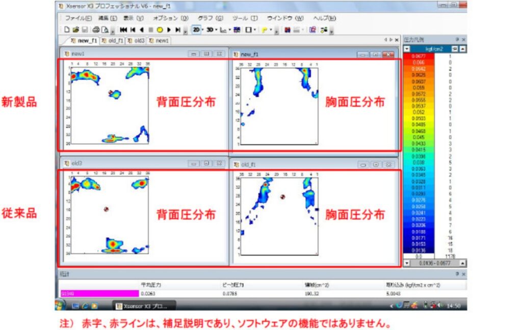 XSENSOR社のX3 PROソフトウェア上では、以下の様に比較表示できます。新製品では、背中中央でも荷重を支えるため、肩、腰、胸部への負荷が軽減される傾向が確認できます。