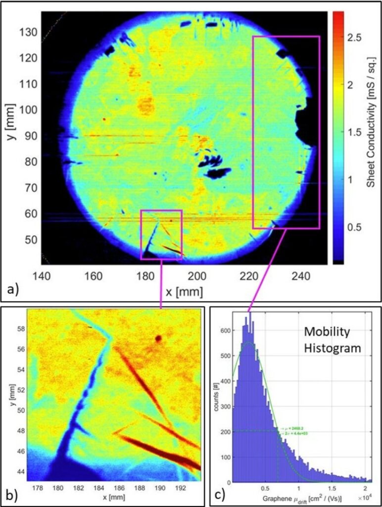 a) 直径4インチのシリコン上のグラフェン層でのテラヘルツ近距離透過測定の結果b) マークされた領域内の高解像拡大画像。グラフェン透過プロセスから判別される欠陥c) マークされた領域のグラフェン層の電荷キャリア移動量ヒストグラム
