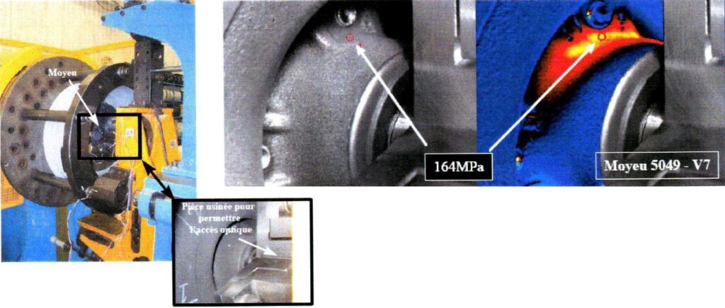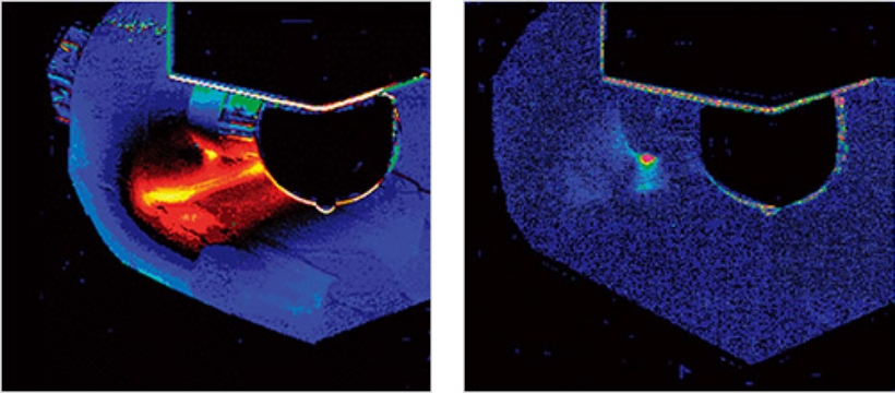 動的応力を加えると、熱弾性効果の原理から対象物表面の温度が変化します。この温度変化を高感度赤外線カメラで捉え、応力値に変換して主応力和の変動量として画像化する事ができます。また、散逸エネルギーの測定により、破損個所や疲労限界点を予測する事ができます。その他、ランプ等を用い対象物に熱変化を加えると、熱拡散の違いを画像化する事により欠陥検出や剥離検査などの非破壊検査装置としてもご使用頂けます。
