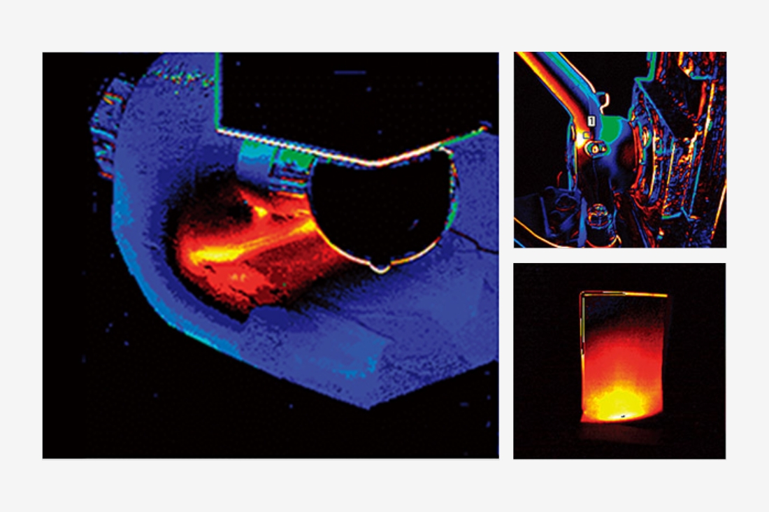動的応力を加えると、熱弾性効果の原理から対象物表面の温度が変化します。この温度変化を高感度赤外線カメラで捉え、応力値に変換して主応力和の変動量として画像化する事ができます。また、散逸エネルギーの測定により、破損個所や疲労限界点を予測する事ができます。その他、ランプ等を用い対象物に熱変化を加えると、熱拡散の違いを画像化する事により欠陥検出や剥離検査などの非破壊検査装置としてもご使用頂けます。